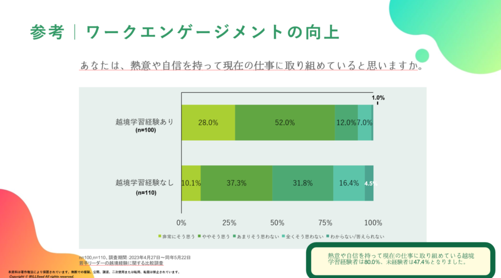 少し話がそれますが、我々が独自に「若手リーダーを対象にした越境学習の経験がある人とない人の比較調査」をしたところ、越境学習経験のある人の方が、仕事に対して前向きな姿勢(ワークエンゲージメント)が30ポイントほど高かった、という結果も出ています。